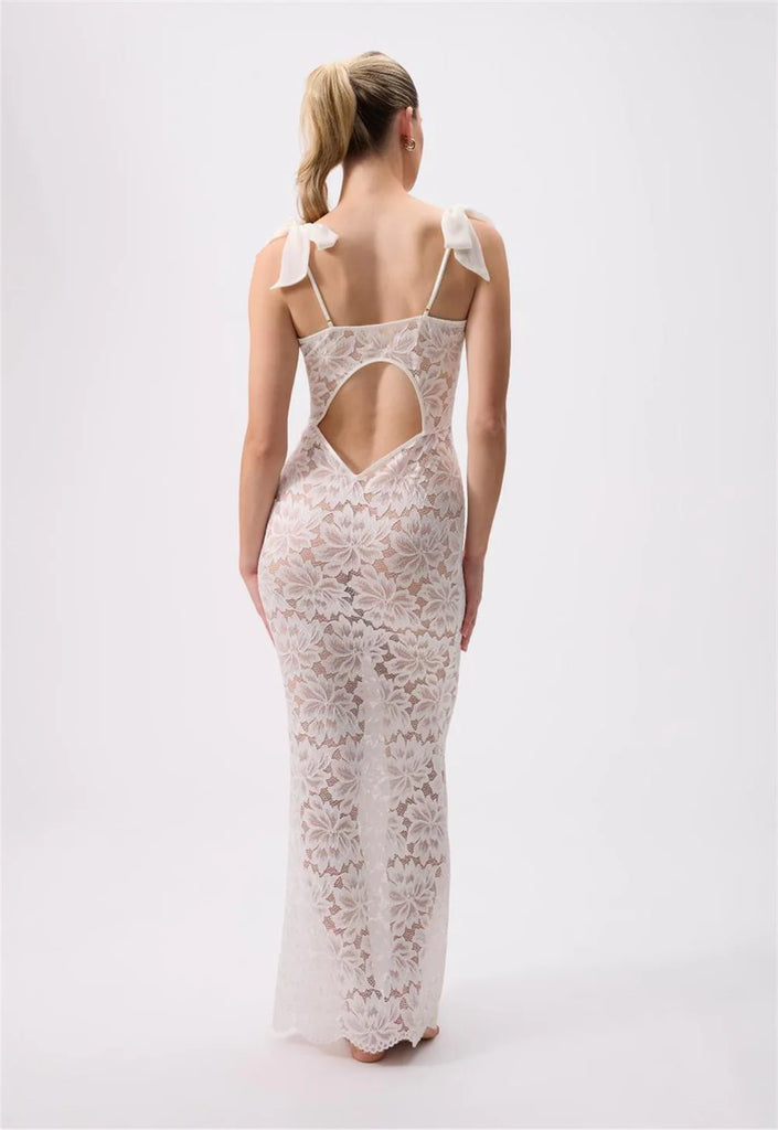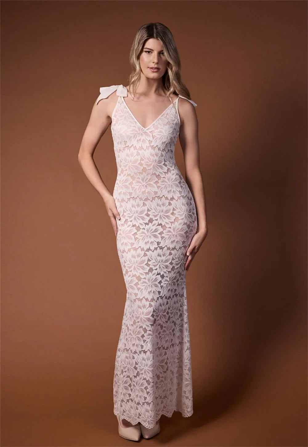 Become obsessed with the Amour Floor-Length Gown. Made with a beautiful stretch lace, this addictively soft silhouette brings out curves you didn’t even know you had with its body-hugging fit. Features a flattering v-neck, curved back cut out, chiffon bows and adjustable spaghetti straps. Wear this for those seductive moments, and dare to style it for date night out.