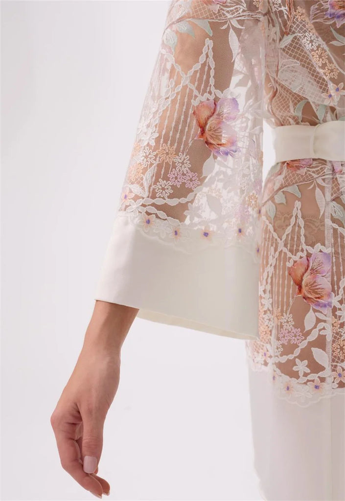 Adorn your special moments with the luxurious look of the Dearest Cover Up. Watercolor-like floral embroidery and charmeuse borders create a classic silhouette that pairs perfectly with the Dearest Chemise.