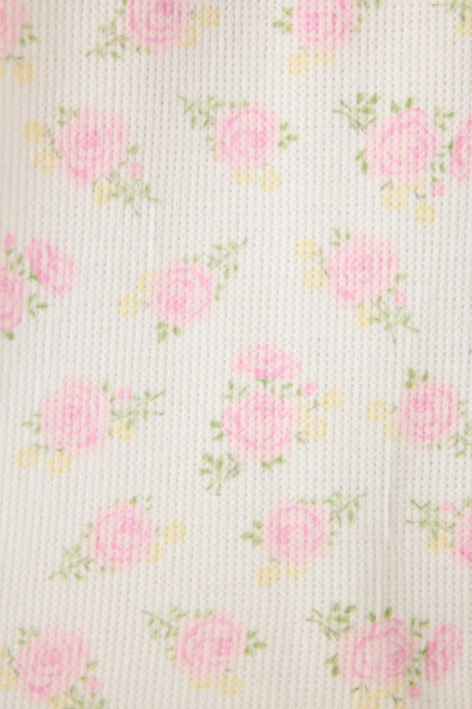Built for slow starts and stop-and-smell-the-roses kind of days, this sweet floral PJ set is made for lazy mornings and hours of lounging. The long-sleeve cropped top features pink ribbed trim and a soft ivory backdrop covered in dainty rosebuds, paired with coordinating boxer-style shorts finished with an elastic logo waistband and faux button fly. The relaxed silhouette makes it feel laid-back, while the soft waffle texture adds just the right touch of cozy.