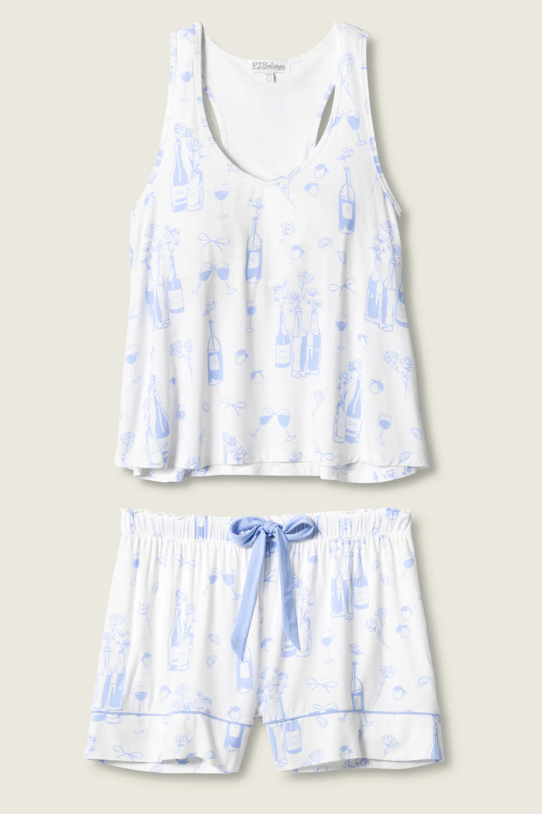This swingy racerback tank and matching shorts set is straight out of a Parisian dream—decked in a toile-inspired print that mixes delicate florals, fresh lemons, and clinking wine bottles a.k.a your dream Eiffel Tower picnic in lounge form. Crafted from soft modal jersey, the tank features a scoop neckline and racerback for easy comfort, while the shorts offer an elasticized waist with a blue drawstring for easy fit and classic blue piping along the hem for a refined finish—a perfectly fresh, coordinated look for relaxed days and cozy evenings at home.