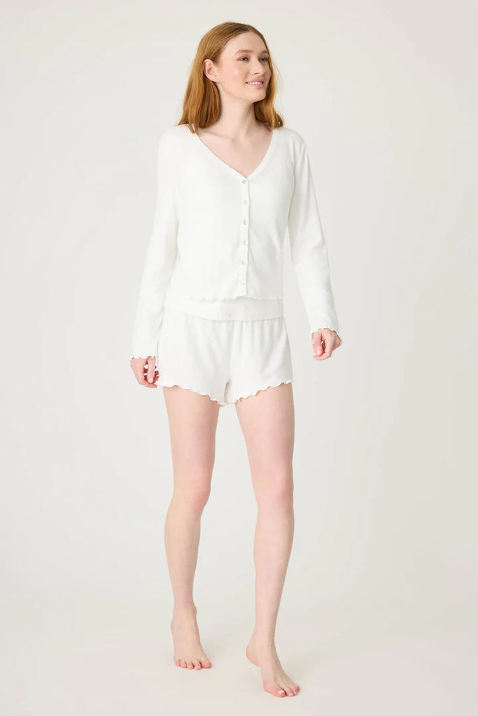 Classic, breathable, and sweet to the core, these ivory sleep shorts are crafted from double-brushed pointelle fabric with a subtle ribbed texture. With an elasticized waistband and playful lettuce-edge hems, they offer a comfy fit that’s as cute as it is cozy—your new year-round sleepwear essential.