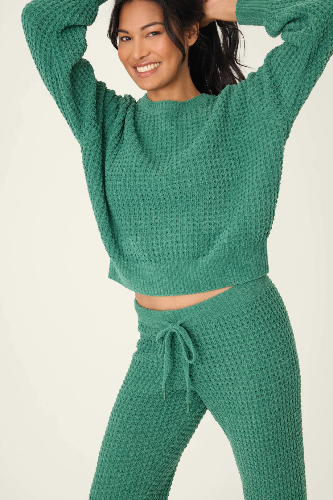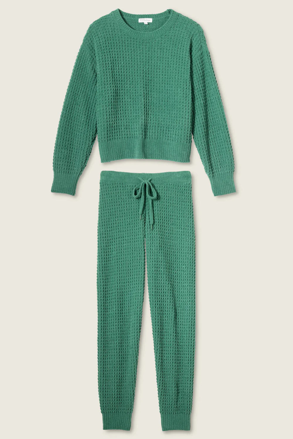 Soft, textured, and built for endless cozy moments, this chenille waffle set is a cold-weather constant. The crewneck top drapes in a relaxed fit with cuffed sleeves and hem for that snug-but-slouchy feel, while the jogger pants cinch at the waist and taper to cuffed ankles for around-the-clock comfort. Done in a deep forest green, it’s the set you’ll reach for on repeat—whether curling up with a book, brewing a second cup of coffee, or riding out the chilly months in style.