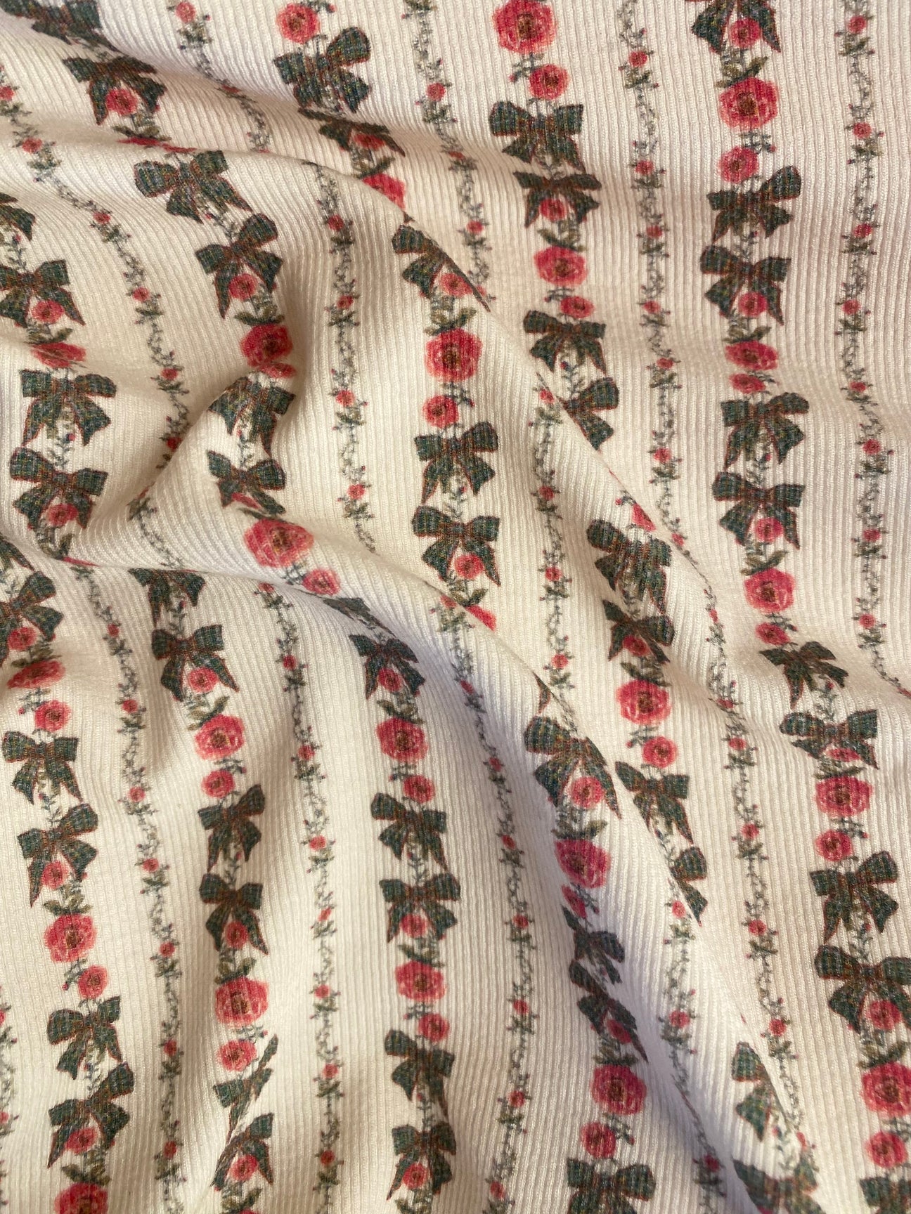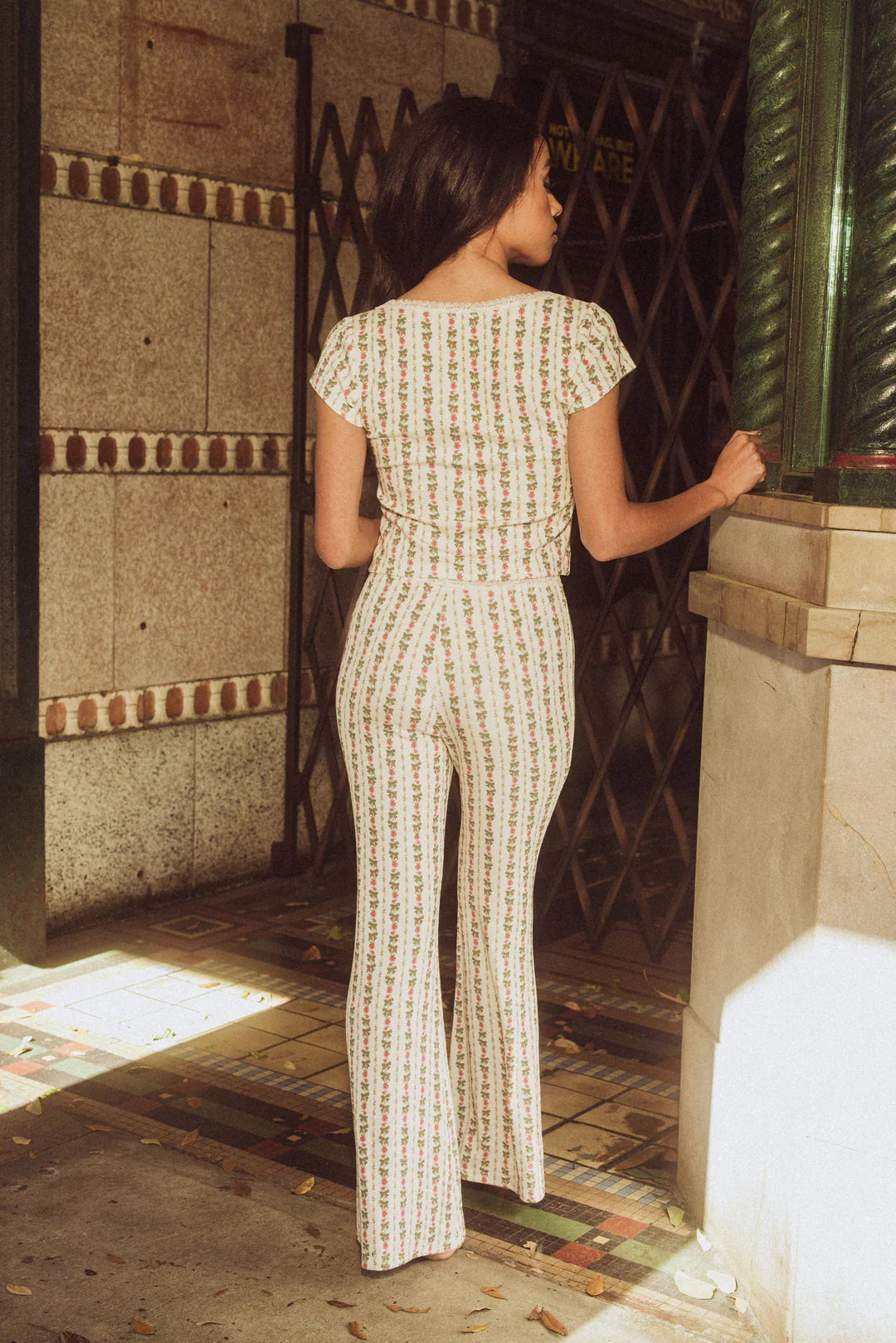 Introducing Kilo Brava’s dreamy cap sleeve tee and flare pants, crafted from luxuriously soft modal and spandex rib for a flattering fit that moves with you. Adorned with our exclusive Heirloom Rose print—delicate ditsy roses and charming bows arranged in a graceful stripe pattern—this piece is pure romance. The digital printing captures every intricate detail with vibrant clarity. Perfect for anyone who loves vintage-inspired florals with a modern twist.